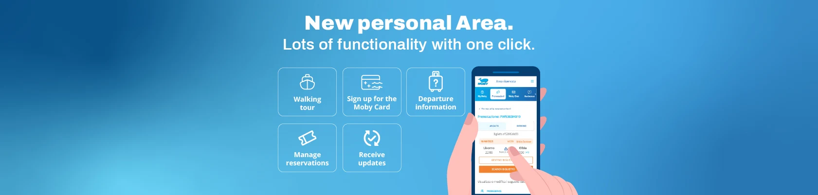From today, Moby offers its passengers the best way to ’navigate" the official website mobylines.com by providing a new personal area that revolutionises the way you manage your tickets. Just as Moby Fantasy and Moby Legacy, the two flagships operating between Livorno and Olbia, have revolutionised the way you travel by ferry. This is because the two ships offer their passengers cruise standards. The project is based on the latest cloud technologies, and users can rely on the security of their data and personal information. After registering in the private area at mobylines.de, users can access a range of functions that guarantee them full autonomy and transparency in the management of their journey. In particular, after logging in to their private area, passengers can automatically view all the bookings they have made and manage them in the best possible way and completely independently. It will therefore be possible to consult detailed information about the journey at any time (timetables, duration of the crossing, name of the ship, port of embarkation and all the details of the crossing); receive real-time updates and notifications of any changes (delays, forecasts, changes) and thus optimise time; view and print their tickets at any time; change or cancel their booking independently and register for the Moby Card programme, which allows them to collect loyalty points, check their account balance and create personalised vouchers. With this initiative, Moby once again reaffirms its commitment to offering a service that is ever closer to the needs of its passengers, focussing on innovation, simplicity, transparency and data security. With Moby, the holiday begins with the journey. And from today, it starts with the management of the ticket in the private area of each passenger at www.mobylines.com.Login or Register